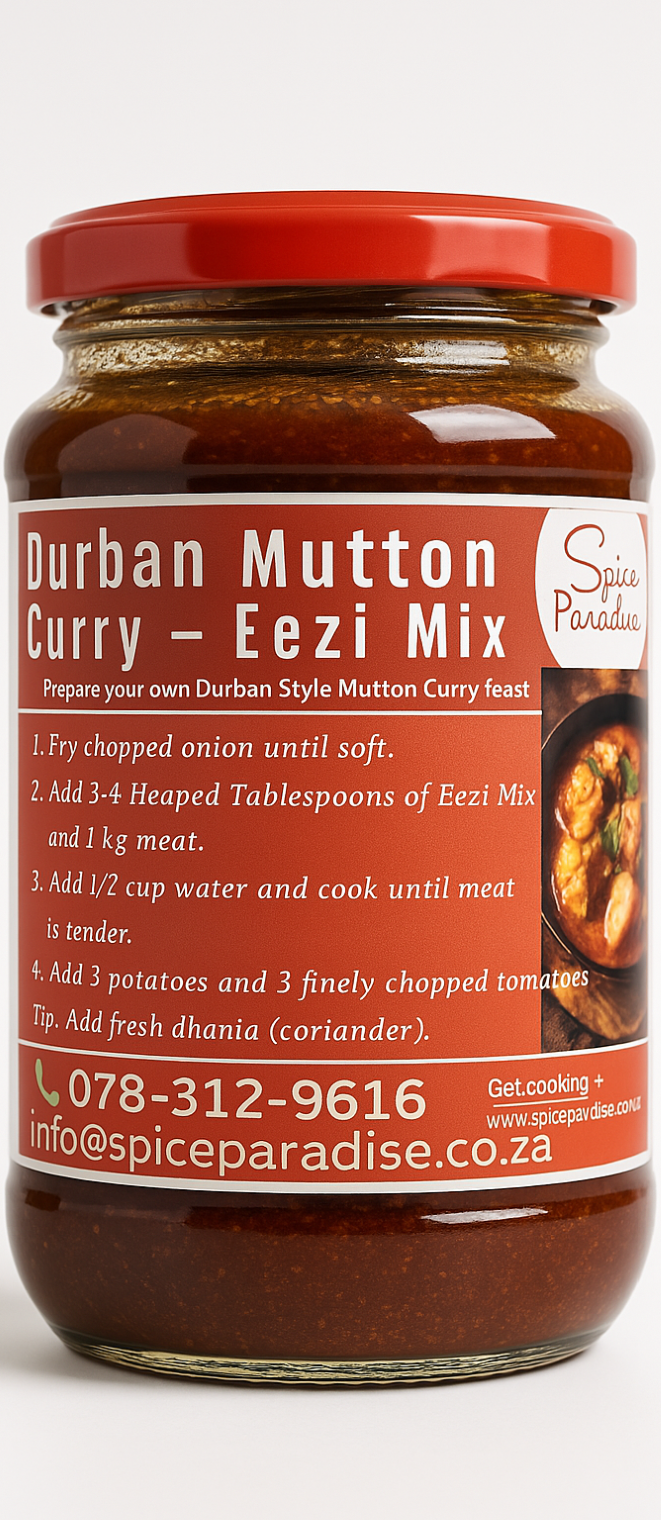 Prepare your own Durban-style curry feast – rich, bold, and full of flavour! Discover the authentic taste of South Africa’s most iconic curry with our Durban Mutton Curry Eezi Mix. Crafted with a traditional blend of premium spices, this mix captures the fiery, aromatic essence of true Durban cuisine – without the hassle. Whether you’re a seasoned home cook or just looking for an easy way to impress your family, this curry mix makes it effortless to prepare a mouthwatering dish packed with flavour. Each jar is a celebration of heritage – combining earthy cumin, robust coriander, spicy chilli, and fragrant curry leaves in just the right balance. Designed to pair perfectly with lamb or mutton, it can also be used with beef or plant-based proteins for a delicious alternative.Why You’ll Love It: